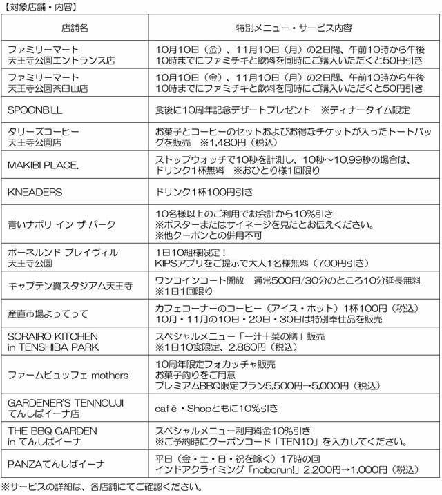 「てんしば」「てんしば i:na 」「茶臼山エントランスエリア」の対象店舗では2025年11月30日(日)まで、10年間の感謝を込めて特別メニューや限定サービスがスタンバイしています。