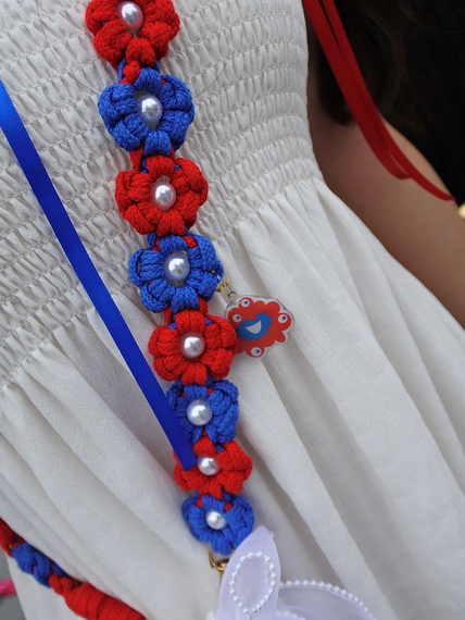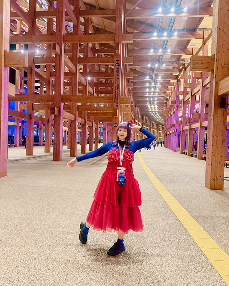 ミャクミャクをイメージした付け襟やワンピースは手作りです。靴下も赤色で揃えました。ネックレスは訪れたパビリオンで頂いたものです。