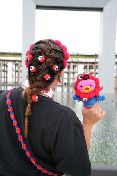 ミャクミャクをイメージしたヘッドドレスやスタンプパスポートに付けているストラップは手編み。ピアスやネックレスも自作しました。東京ではミャクミャクグッズがあまり売っていなく、せっかくならと作りました。