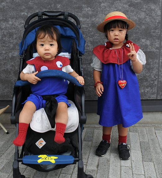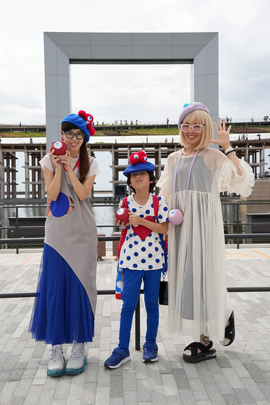 Tシャツがお揃いです。赤と青でミャクミャクをイメージしてコーディネートしました。うちわは親戚の子供が折ってくれたものです。