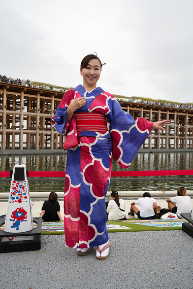ゆかたは以前から持っていたもので、赤と青の組み合わせがミャクミャクみたいで選びました。