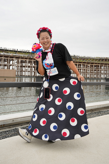 会場では、暑さが厳しい中でも個性あふれるファッションで万博を楽しむ来場者が多かった。①ファッションのこだわり②万博の思い出――を聞いた。