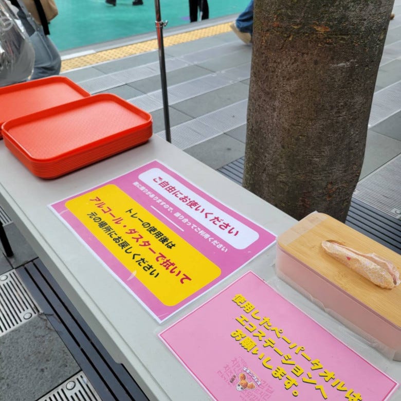 「食べ物が落ちないようにトレーに乗せて食事も楽しんでください」という配慮が感じられました。また、食後もペーパータオルで清潔感を保てます。