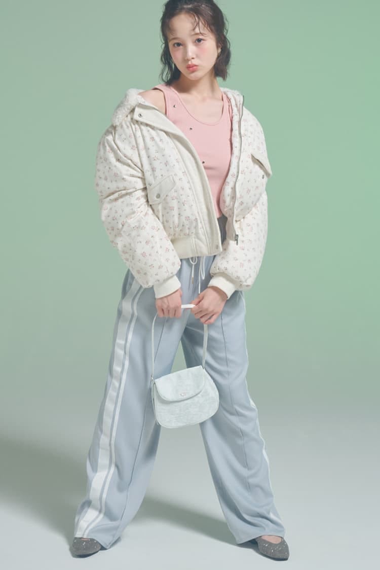 トップスの色を拾った、ピンクの花柄アウターで2色をさらになじませて。