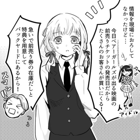 前売りのチケットを求めて押し寄せる多くの人に驚く主人公。