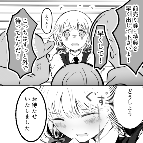 しかし、先輩はバックヤードから戻ってきません。まだ仕事に慣れていない主人公。ひとりでどうやってお客さんを対応するのでしょうか……?