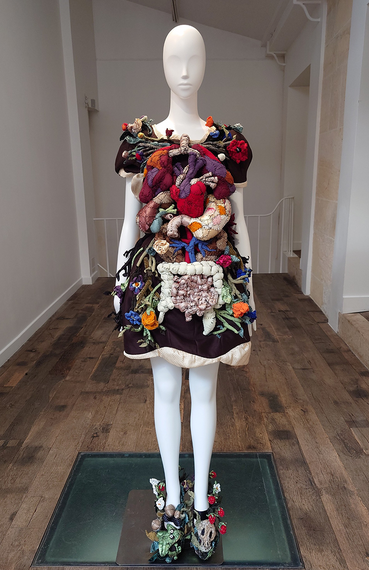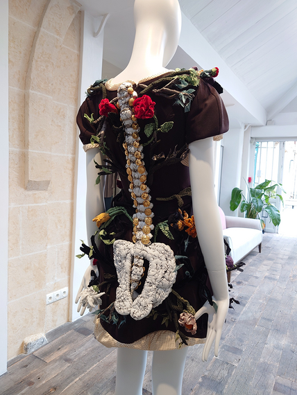 前シーズンに続いて、フランスのぬいぐるみ作家のアン・ヴァレリー・デュポンとの協業にも取り組んだ。人間の臓器と骨格をぬいぐるみで表現したドレスだ。毛細血管が広がるように花や植物を交えて生命力を感じさせている。