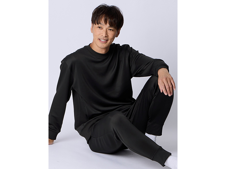 素材はポリエステル49%・レーヨン44%・ポリウレタン7%。カラーはブラック、ネイビー、グレージュ。サイズはS~3L(全5サイズ)。リカバリークルーネックロングスリーブが税込み5390円、リカバリーロングパンツが4290円。