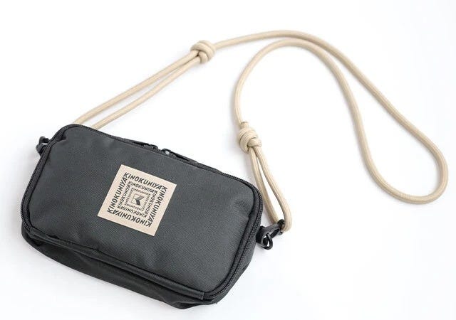 ベージュのショルダーストラップが映える、濃いグレーカラーのお財布ショルダーバッグ。ショルダーストラップは長さ調節と取り外しができるので、本体をポーチとしても使えます。