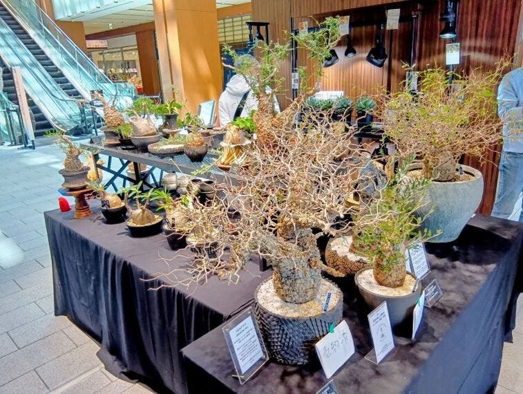 市場の拡大と新流通の開拓は植物関連にも共通している。「カニック」(H-44)は塊根(かいこん)植物や珍奇植物などを扱う輸入植物専門店。24年10月展に参加して「ファッション流通へのアプローチが(塊根植物)市場の拡大につながると実感した」と言い、プラントハンターとしてマダガスカルや南アフリカで一点ずつ買い付けたパキプスやユーフォルピアなど初心者向けの数万円から数十万円、100万円超まで揃えている。