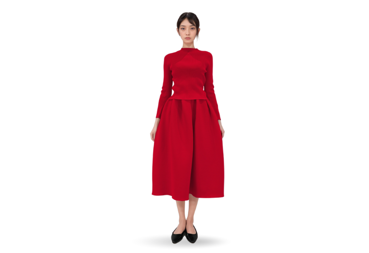 代表商品はリブのプルオーバーとコクーンスカートのセットアップ。ほか、立体的なペプラムのノースリーブトップと裾のフリルがポイントのマーメイドスカートなど。全て56色展開。ボトムはカラーと同時にサイズ選びの楽しさも設けて、服選びのイベント感を演出する。素材は張りと発色が良い国産のポリエステル。しわになりにくく、家庭洗いできるイージーケアも追求している。売り先とも「必要なだけ作る」を貫いて委託販売とし、少ロットで対応している。