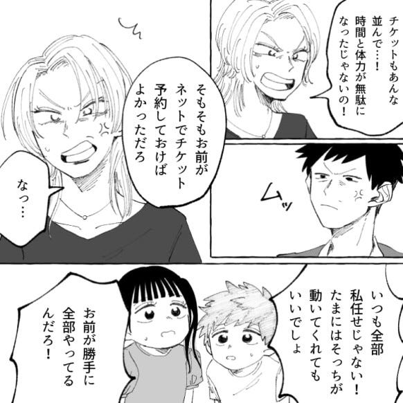 喧嘩しないで…!チケットが取れずに子どもの前で揉め出した夫婦…主人公はどう宥める!?