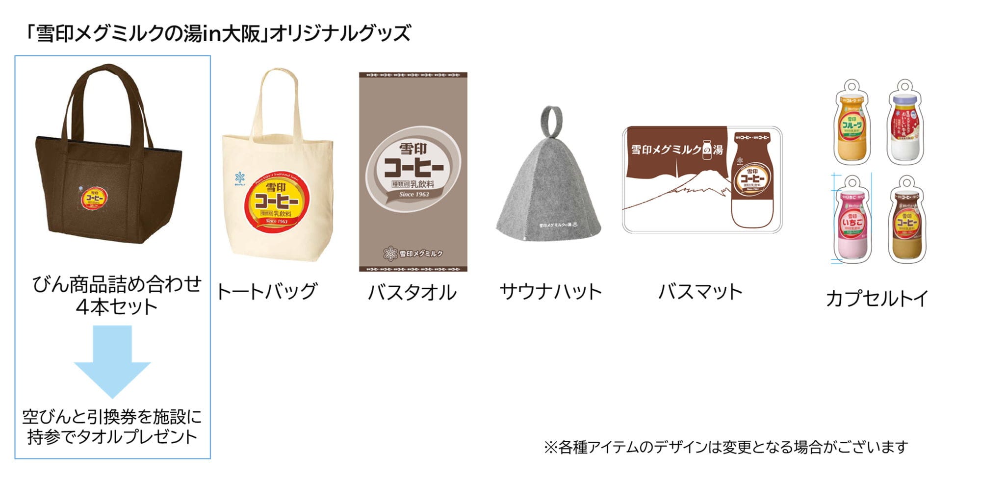 会場では、自動販売機や宅配専用で販売中の「雪印コーヒー」「雪印フルーツ」「雪印いちご」が入った「びん商品詰め合わせ4本セット」(1,500円)や、トートバッグ(2,000円)、バスタオル(3,500円)、サウナハット(3,000円)といったオリジナルグッズが販売されます。いずれのアイテムも数量限定です。