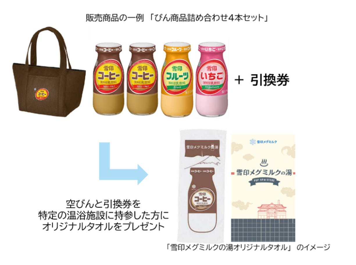 さらに、「びん商品詰め合わせ4本セット」を購入すると、大阪府内の特定の温浴施設で「雪印メグミルクの湯オリジナルタオル」と交換できる引換券が1枚もらえるのだとか!
