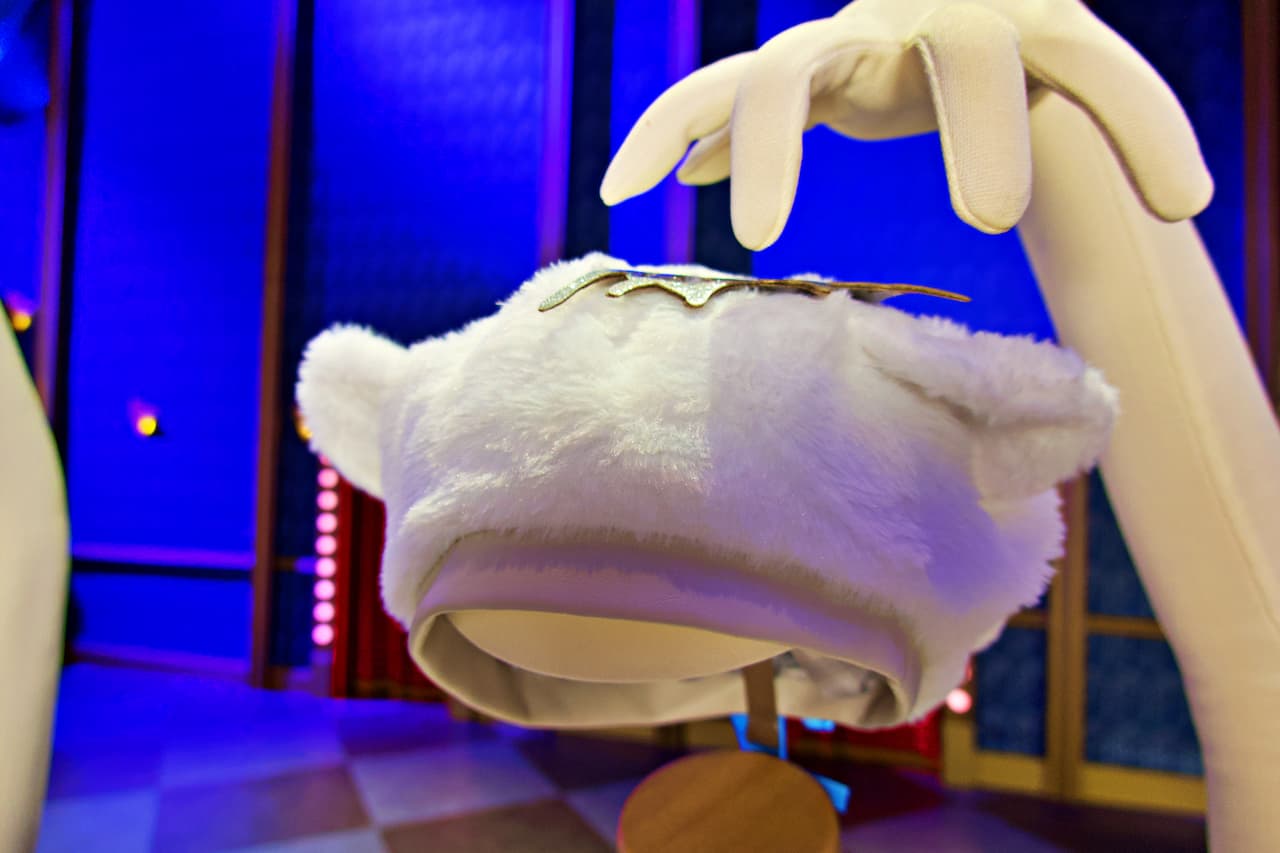 「ベレー帽」(4,600円) 真っ白&ふわふわの、ハミクマソウルのかわいい「ベレー帽」が登場。後ろから見ると、ハミクマソウルの顔が現れるという凝ったデザインで、キラッと輝くラメ素材の王冠やキャンディ風のブローチがポイントです。耳の部分が立体的になっているので、かぶると耳が立ち上がってとってもキュート!