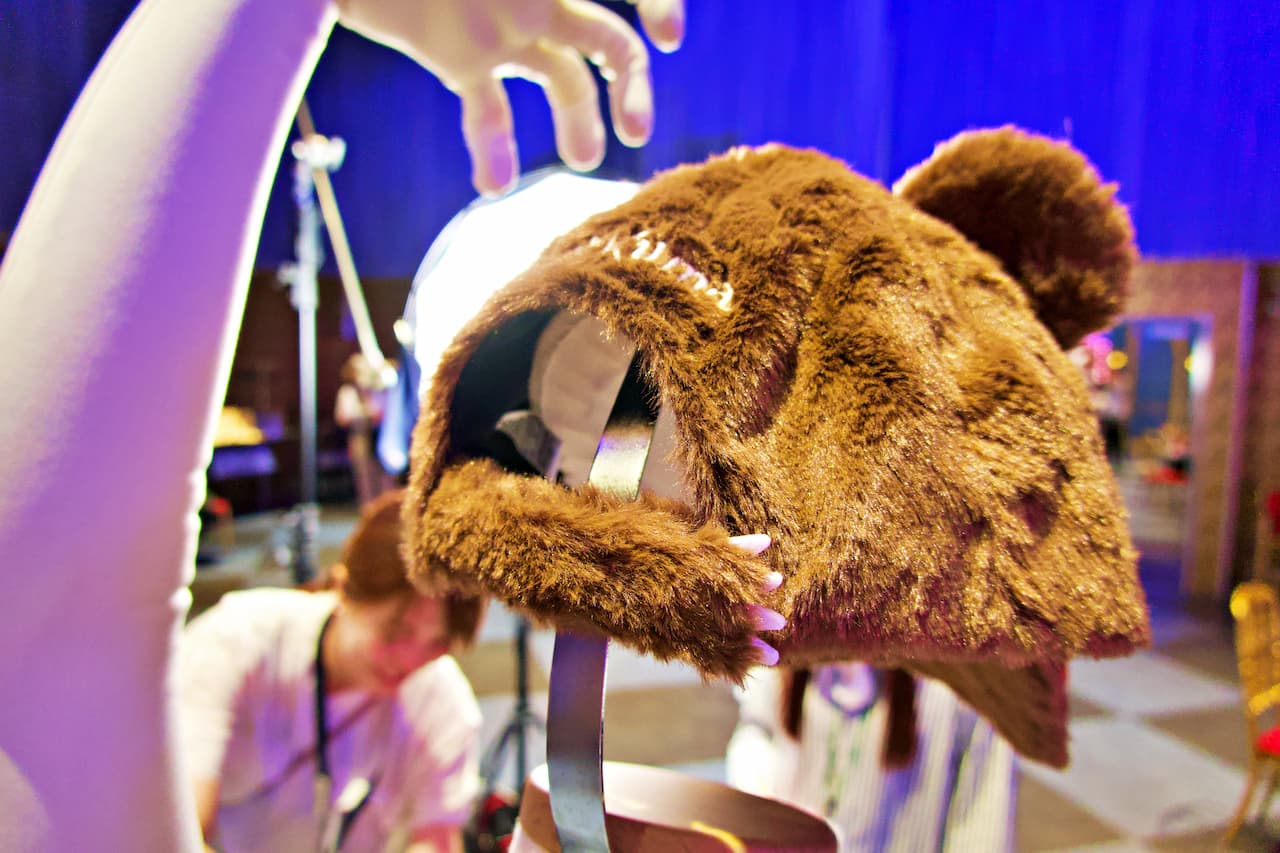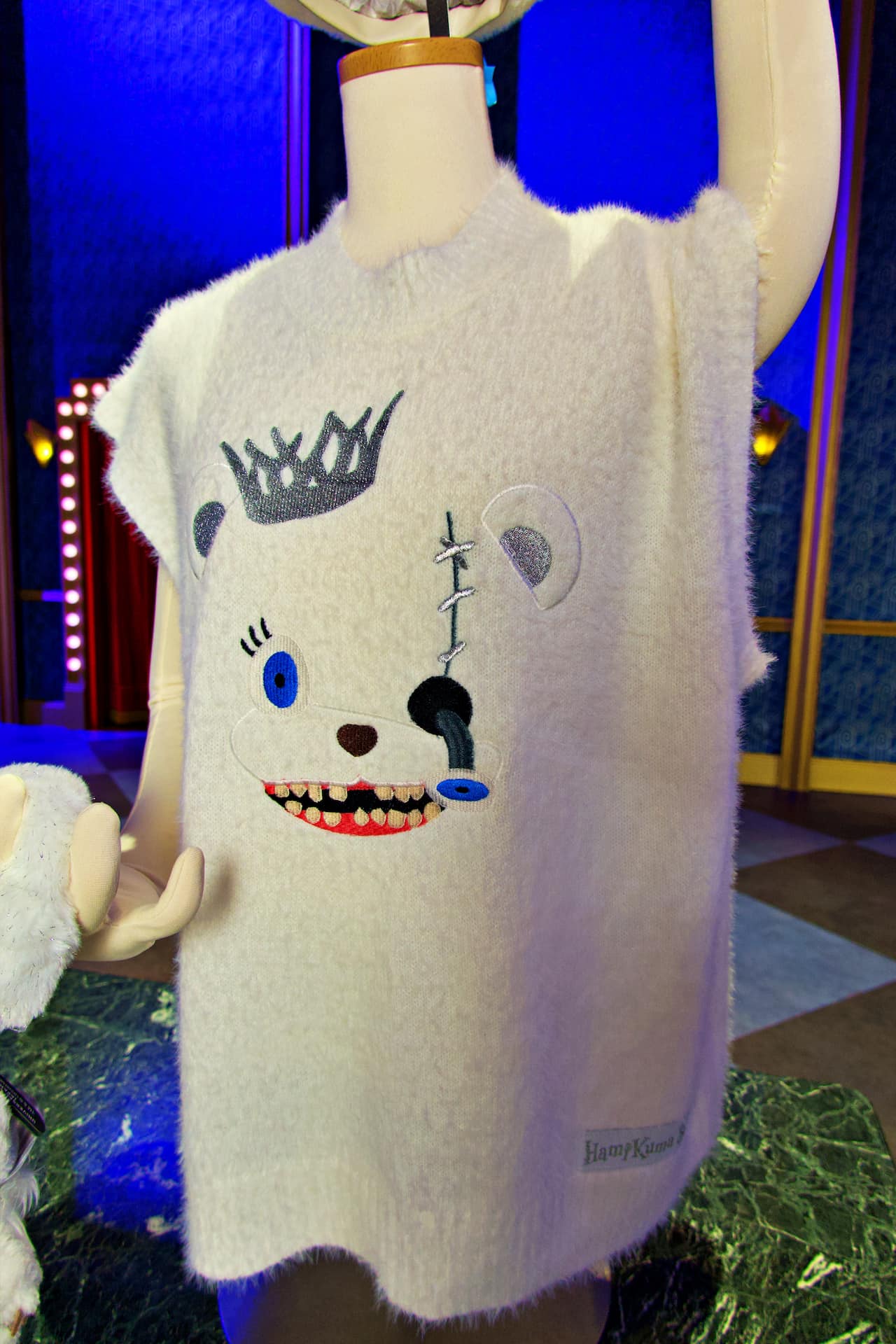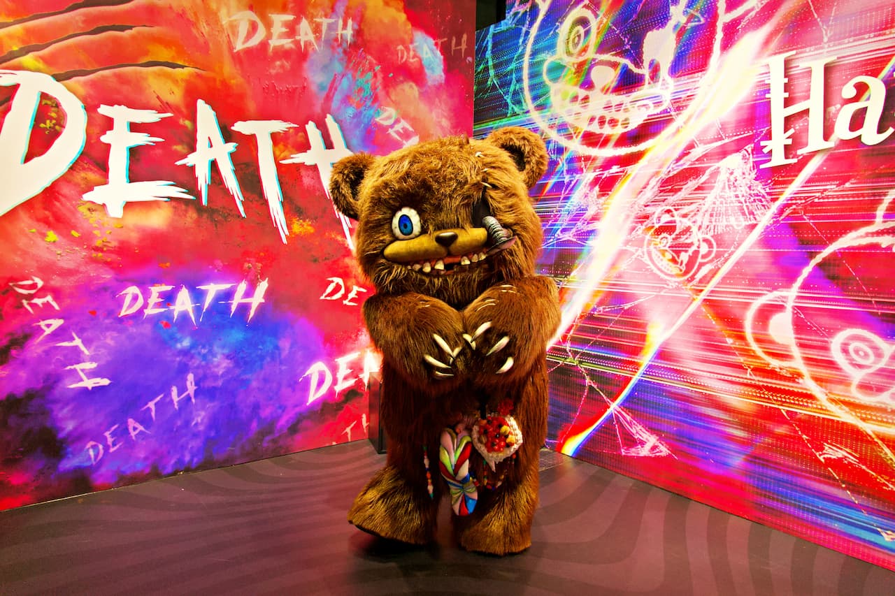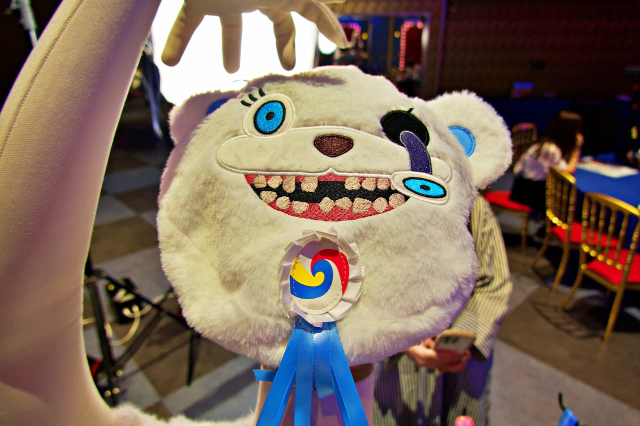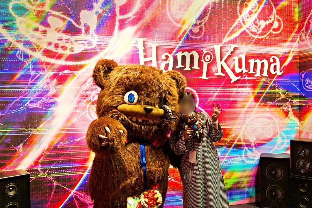 ゲストはまず、ハミクマかハミクマソウル、どちらと写真を撮るか究極の選択を行います。私はハミクマを選択させてもらい、ドキドキしつつスタジオの中へ入ると、「ハミクマ・スウィート・スクリーム・パーティ」のバックステージをイメージした部屋でハミクマとご対面。こんなに近くでハミクマを拝むのは初めてだったので、その愛らしさ、禍々しさを独り占めできてテンション上がりまくり!