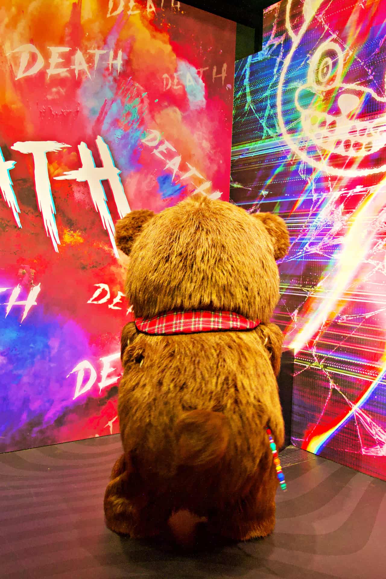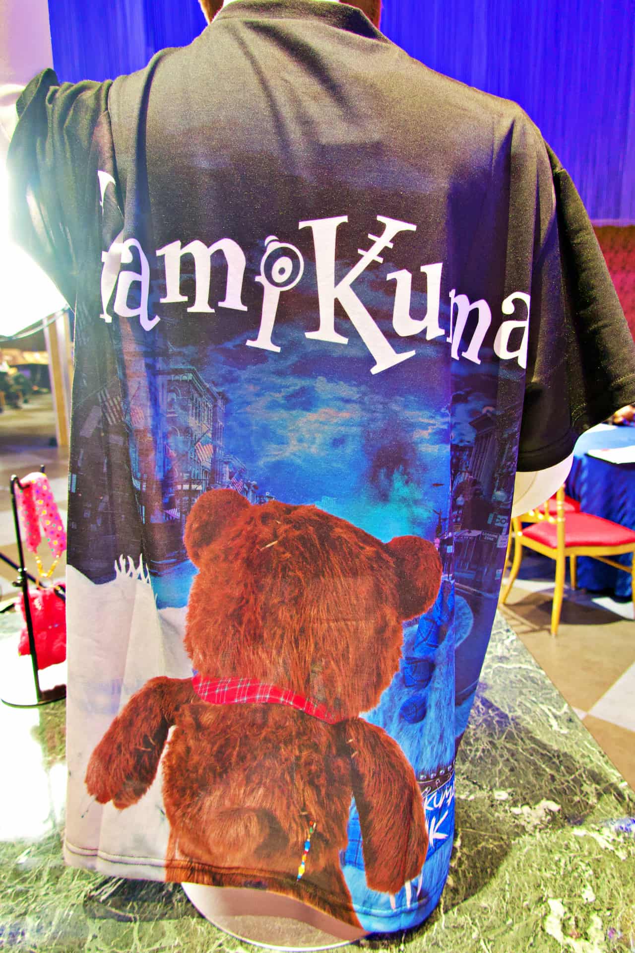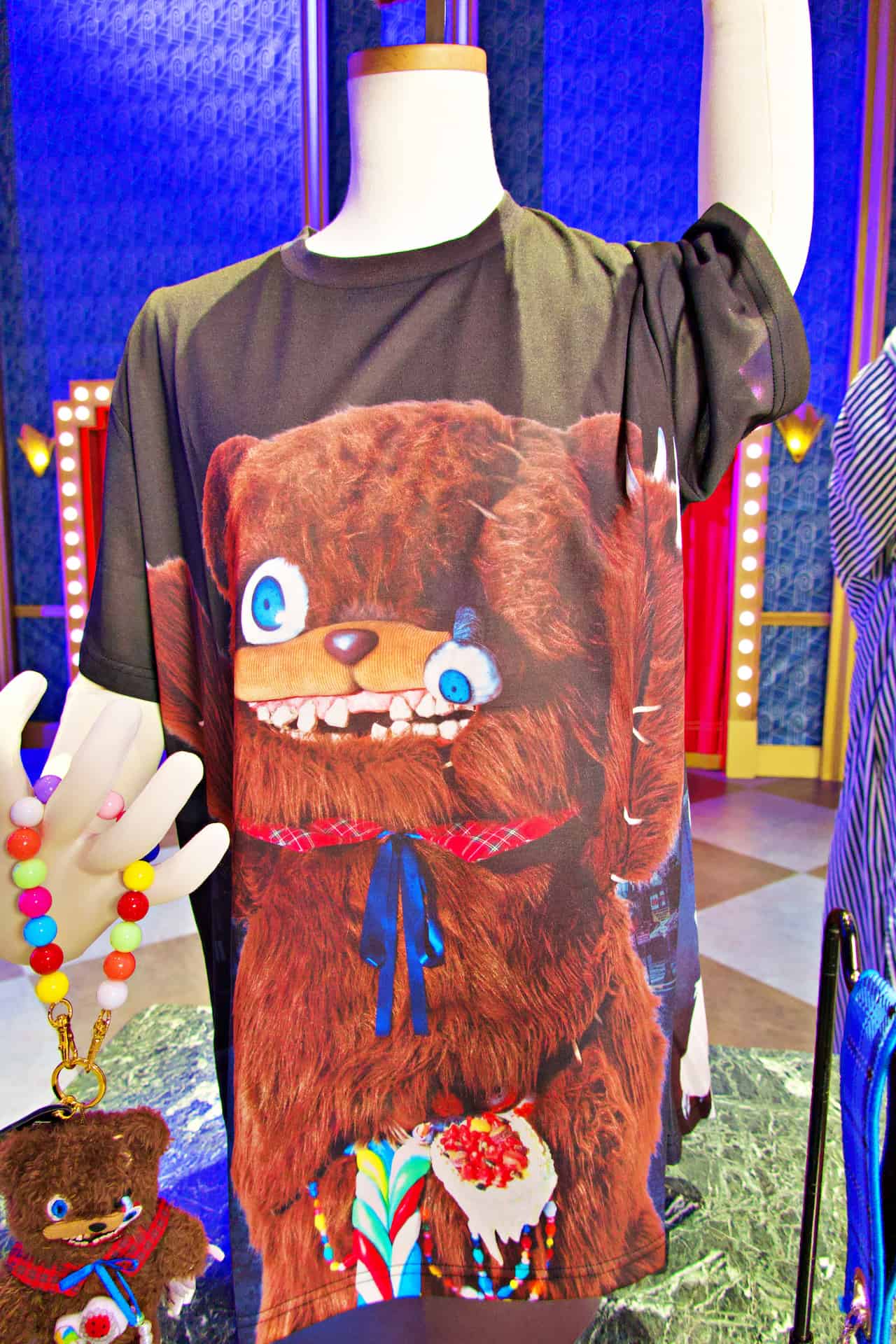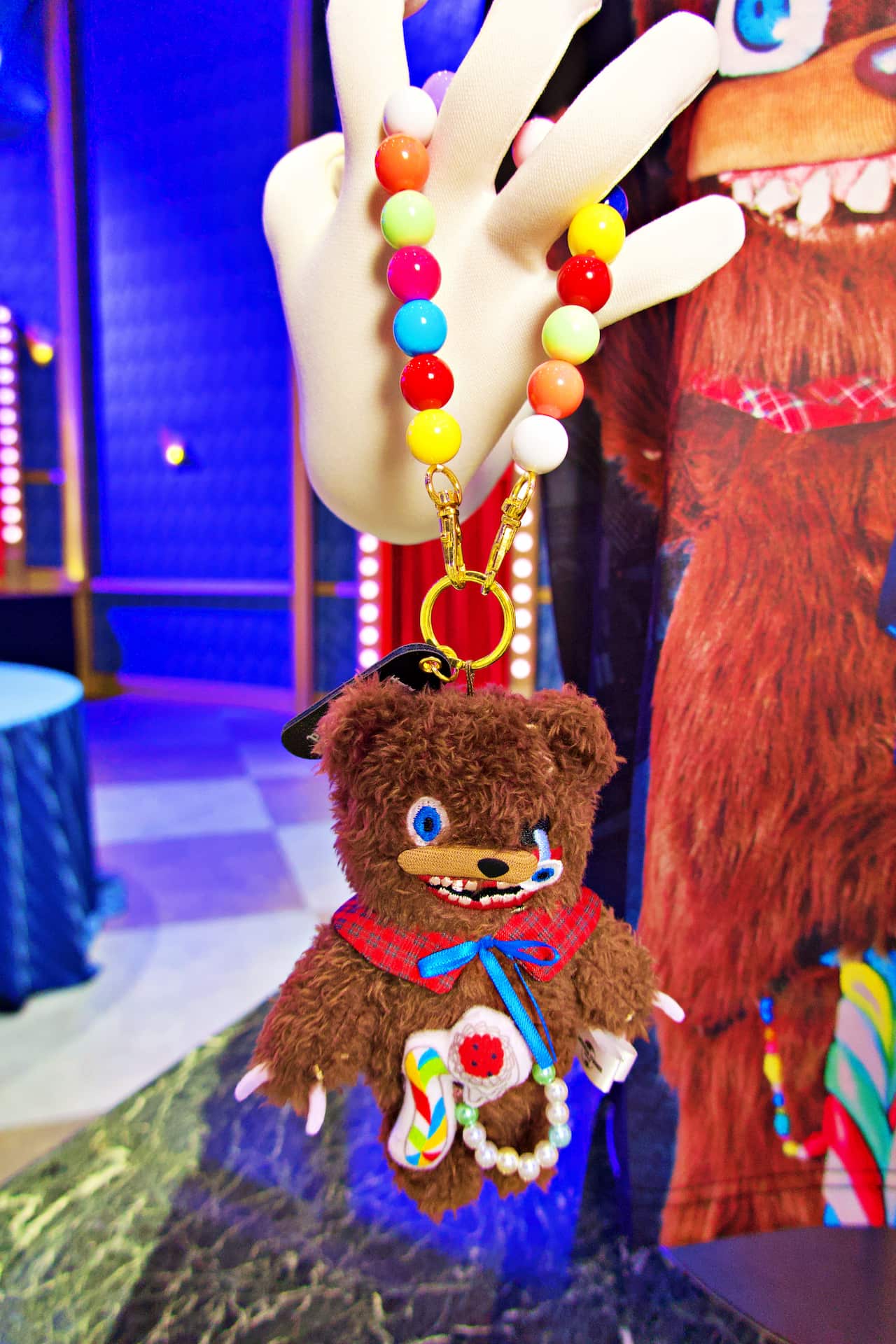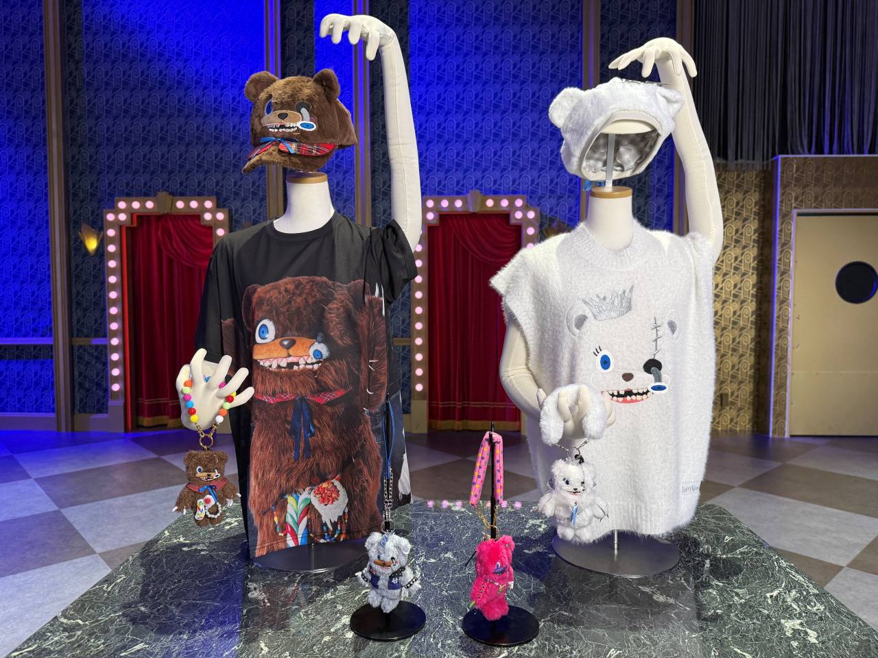 ゲストはまず、ハミクマかハミクマソウル、どちらと写真を撮るか究極の選択を行います。私はハミクマを選択させてもらい、ドキドキしつつスタジオの中へ入ると、「ハミクマ・スウィート・スクリーム・パーティ」のバックステージをイメージした部屋でハミクマとご対面。こんなに近くでハミクマを拝むのは初めてだったので、その愛らしさ、禍々しさを独り占めできてテンション上がりまくり!