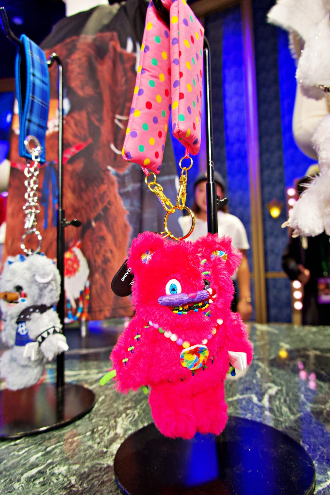 「ストラップ付きマスコットキーチェーン(ハミクマキャンディ)」(2,900円) ハミクマ、ハミクマソウル、ハミクマパンク、ハミクマキャンディのマスコットキーチェーンは定番アイテムですが、今年はストラップがそれぞれの個性に合わせたデザインにリニューアル! ハミクマは原色カラービーズ、ハミクマソウルは真っ白ふわふわ、ハミクマパンクは青いチェック柄、ハミクマキャンディはカラフルなドットに。カバンに付けるだけではもったいない、手に持ってパークを歩きたくなるかわいさです♡