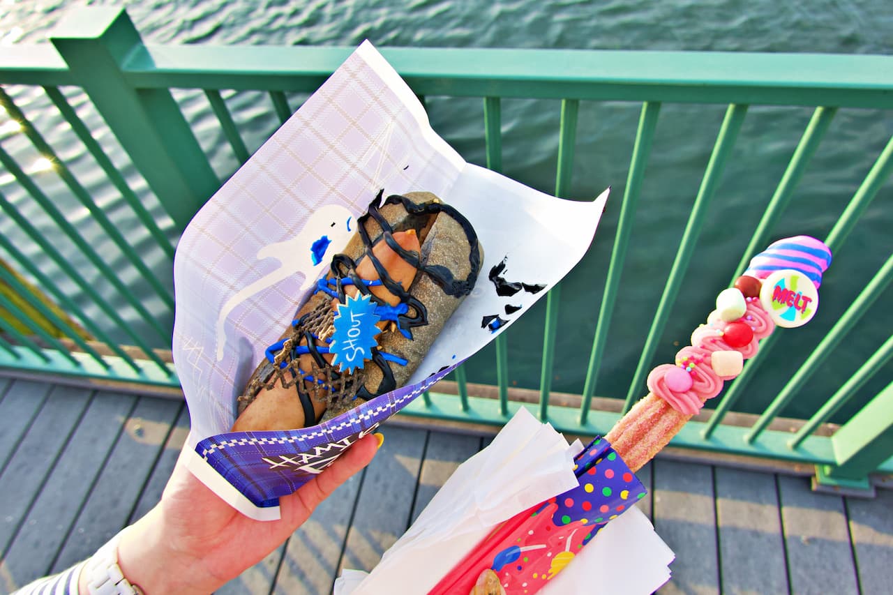右:「ハミクマキャンディ・チュリトス〜ストロベリー・キャンディ〜」(850円) 左:「ハミクマパンク・ドッグ〜ブラックチーズソース&ペッパー〜」(1,100円) 「ハミクマキャンディ・チュリトス〜ストロベリー・キャンディ〜」は、ビビッドでスウィートなハミクマキャンディをイメージ。チョコやマシュマロ、先端のトロリとしたキャンディで、写真映えも抜群です!
