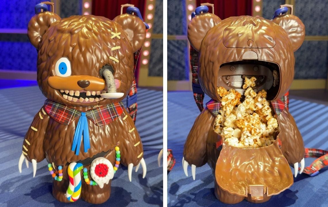 「ハミクマ・ポップコーンバケツ」(5,500円) パーク史上初となる「ハミクマ・ポップコーンバケツ」も登場! 飛び出した目にボロボロの歯、お腹からはみ出すアレやコレ、鋭い爪など、“グロかわいい”ルックスがたまりません♡