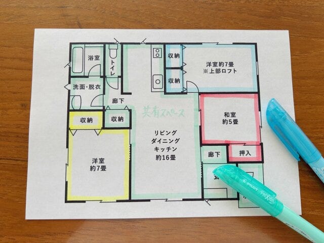 共有エリアと個人エリアの仕分けは、一度間取り図を使って色分けしてみるのがおすすめ。視覚的にわかりやすくなります。