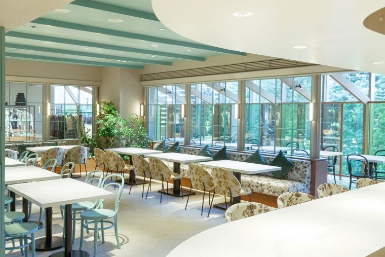 改装のキーワードは、デビューから57年となるロペに通じる伝統と革新。ブランド名の由来となった南仏サントロペをイメージし、ロペはサントロペにあるホテルのロビー、アダムはアートギャラリー、サロンは家、ベイクはサードプレイスに着想した。フロア全体でサントロペの街を巡るようなイメージだ。