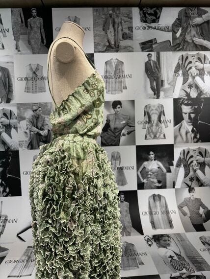 ブランドを象徴するグレージュから淡いグリーン、柔らかな質感で展示を統一。年代ではなく、色と質感を切り口に、空間全体で一貫した美意識を体感できる。肩パッドのないソフトジャケットやスパンコールドレス。装飾的なものも、アルマーニらしい抑制が感じられる。11月16日まで。