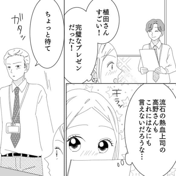 植田さんの完璧なプレゼンに対して、熱血なあまり文句を言う上司の高野さん。