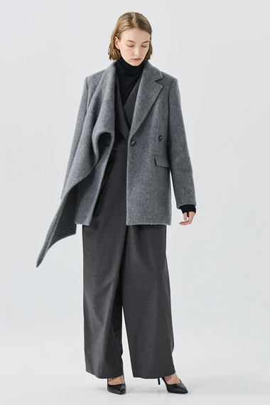 代表アイテムは、サテンのテーラードジャケット(税込み5万3900円)やジャンプスーツ(6万9300円)、マフラーパーツの付いたウールシャギーコート(6万9300円)など。全てのボトムとジャンプスーツに、ウェアラブルヒーターを内蔵したタイツがつくのがユニークだ。寒暖に合わせて着脱できる。ホールガーメントのニットトップ(3万9600円)は、フリルパーツを胸元や裾など好きな位置に飾れる。ショルダーベルト付きで、肩掛けや持ち運びがしやすいテーラードジャケットなど、主張しすぎない形で機能を加えたアイテムが揃う。また、期間限定店の会場ではAI(人工知能)ファッションデザイナーのキノムラミホ氏と協業したアイテムも展示して見せた。