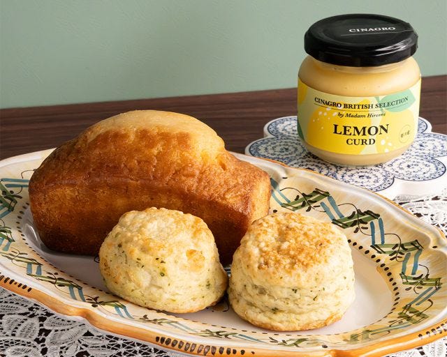 シナグロ ブリティッシュ セレクション バイ マダムヒロミ「パルミジャーノ香る有機クレソンのスコーン」(368円)、「アンのレモンケーキ」(998円)、「四万十有機レモンのカード」(1,280円)※PART2のみ出店