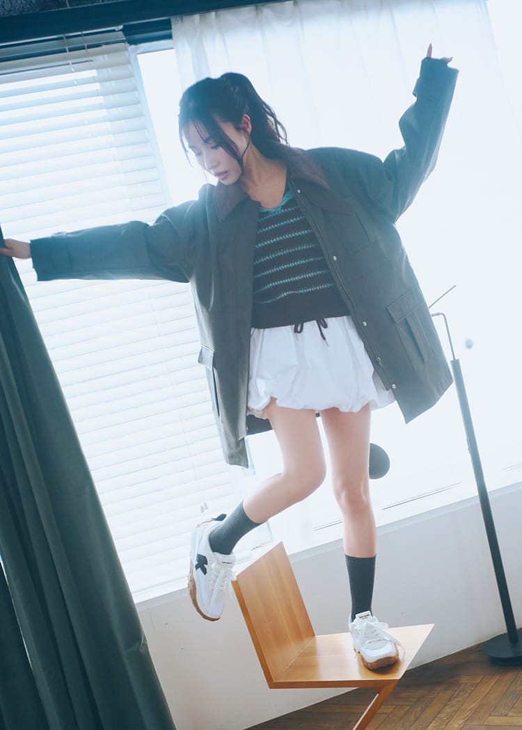 アウターにすっぽりおさまるミニスカ丈でコンパクトなシルエットに