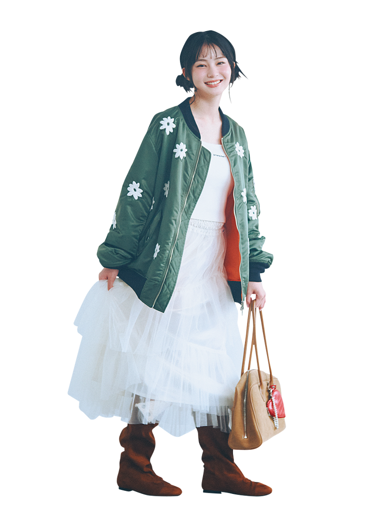 ボーイッシュなアウターは、ミニや女のコらしいフリルスカートを味方につけて体型カバーを目指すのが◎。