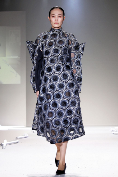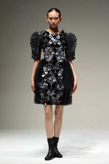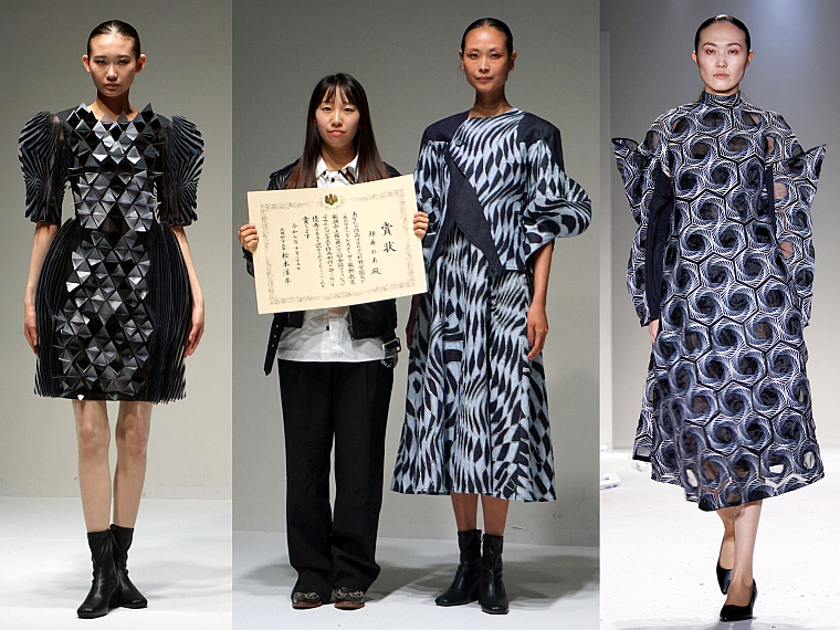 松井さんは、ひし形にレーザーカットしたパーツで作った生地に光が反射し、照明に映える作品で受賞。中城さんは六角形のナットのような幾何学模様が並ぶ中、ねじれた線や崩れたパターンの模様が混ざり合うオリジナル生地のドレスで、感情の揺らぎを表現した。