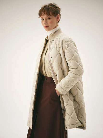 スタンドカラー・ダウンジャケットは裾にギャザーを入れ、ふんわりとしたシルエット。リブカラーキルト・ダウンコートはクラシックなダイヤキルトを施した。ロングダウンベストパーカはロング丈のフード付きのベストで、レイヤードを楽しめる。ノーカラー・ダウンコートは女性らしいデザインと表のステッチを最小限にしたソリッドな表情が上品だ。