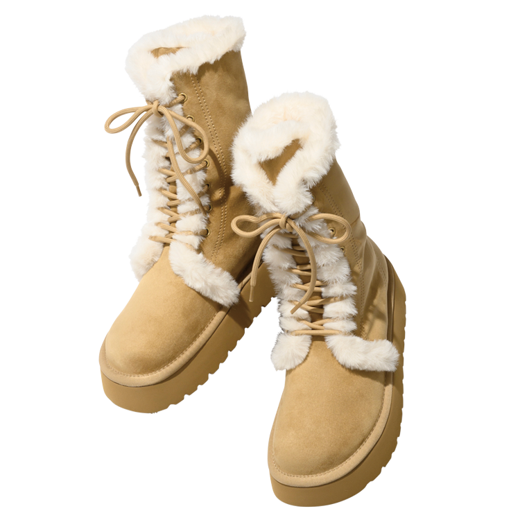 レースアップデザインとボリュームのあるプラットフォームソールが印象的なミッドカーフブーツ。