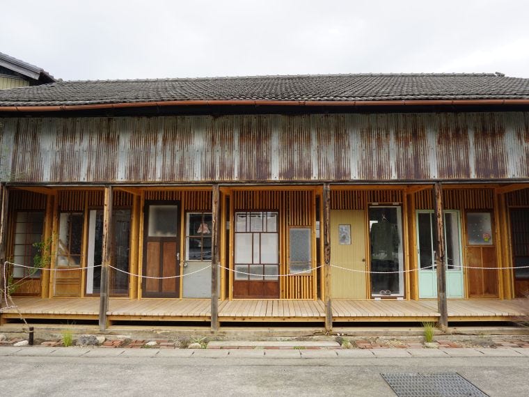 工場南の道路側に人々が集えるように、縁側を作った。改修にはストック木材や不用になった建具を活用。縁側から見ると古い扉が幾つも並び、かつての人々の生活が連想される。