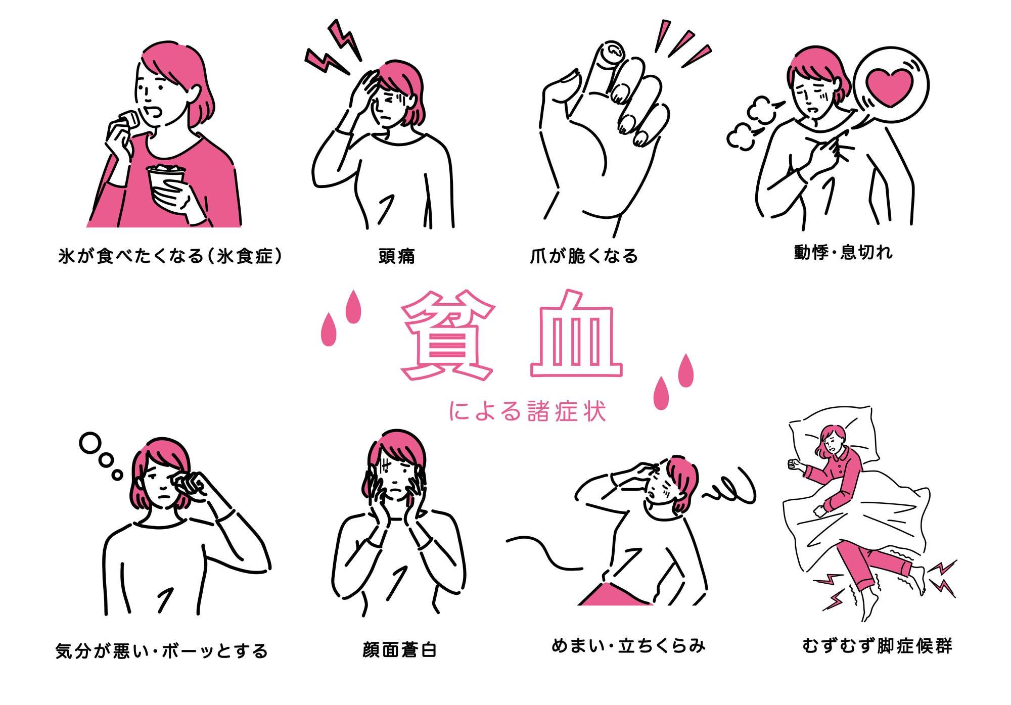 女性の場合、その原因の多くは月経による鉄分の喪失です。徐々に進行して慢性化するため、身体がその状態に慣れてしまい、自覚症状がないことも珍しくありません。