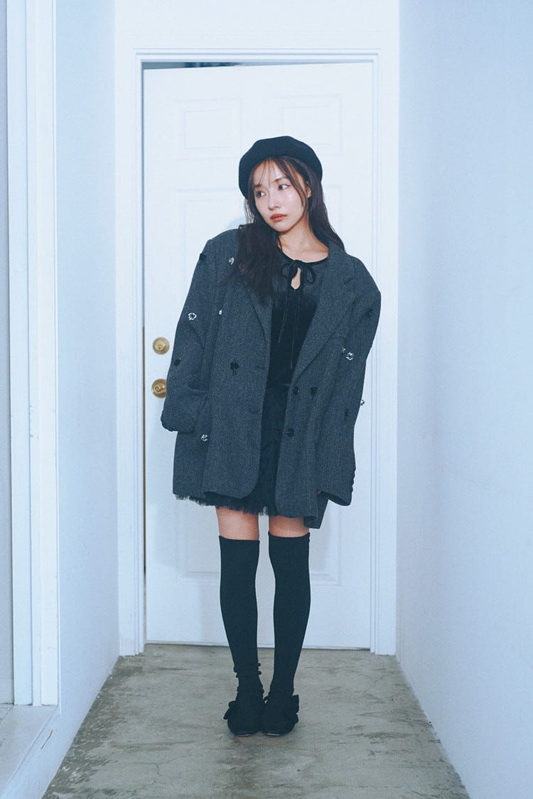 クラシカルジャケットも今年はサイズ感がさらに大きく進化!だからこそ、ミニボトムで抜けを作って全体をスッキリ見せるのがポイント。