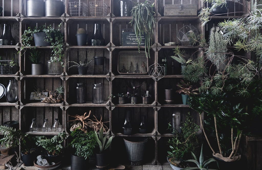 「garage TOYOHASHI」(海外のアップルBOXを使用したディスプレイ) 店舗内では、植物の選び方からディスプレイ方法、育て方に至るまで、スタッフがきめ細やかにアドバイス。また、「もったいない精神」を大切にしてきたことから、空間にはリサイクル材を使ったディスプレイや、再利用可能なアイテムを多く取り入れているのだとか。