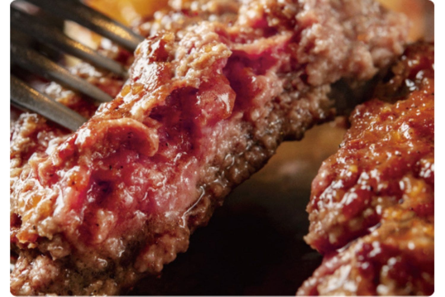 【精肉店直営の肉居酒屋 グッドグッドミート】「熊本県産牧草あか牛と放牧豚と蝦夷鹿のハンバーグ」(858円)