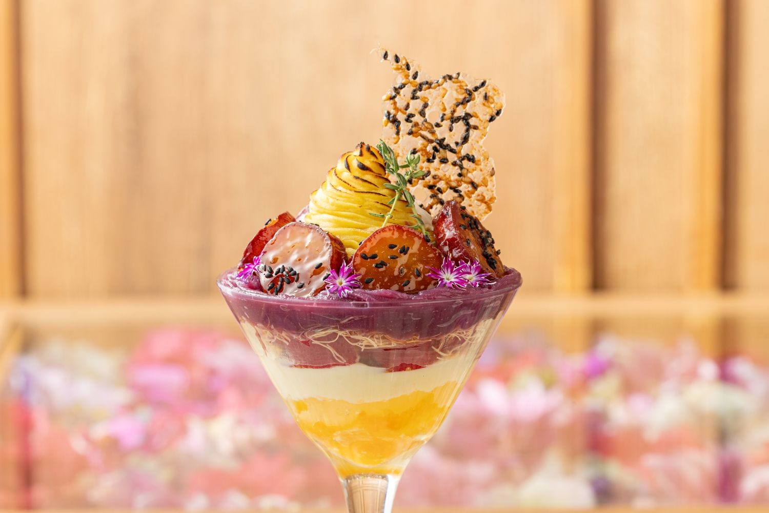 【パフェ ジェラートラルゴ】「パルフェ・ア・ラ・パタット・ドゥース」(1,980円) 「くまもとモン× 大阪梅田ジャック」期間内は、ルクア大阪内の飲食店で特別メニューも販売!