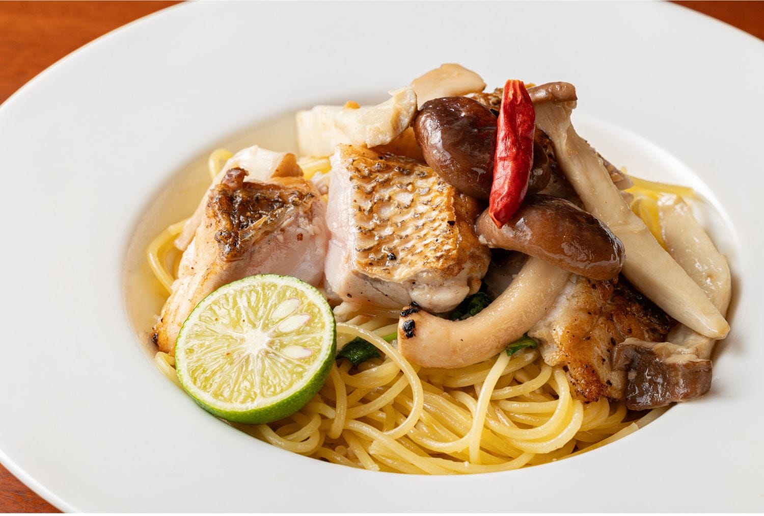 【スパッカ アルバータ】「熊本天草の天然真鯛と松茸のペペロンチーノ 酢橘の薫り」(2,200円)※ディナー限定