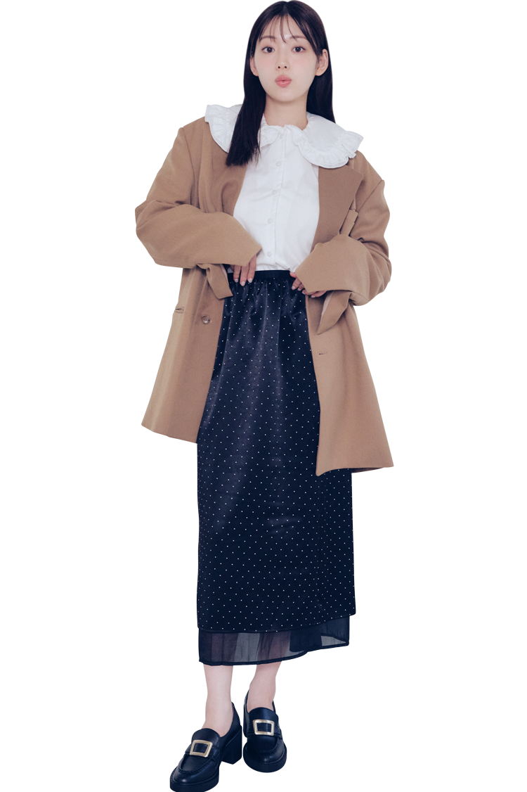 デコラなブラウスに、タイトなスカートがクラシカル。世界観を崩さず、よりキレイめな印象をつくれるジャケットが頼りになる。