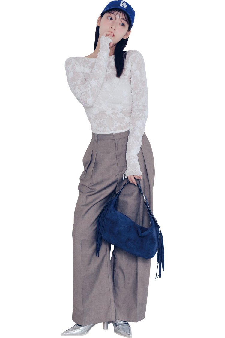 発色のいいアイテムでも、浮くことなくクールに決まるのが青の優秀さ。透け感のあるややドレッシーなトップスや、女みのある靴合わせでレディな雰囲気をプラスして。