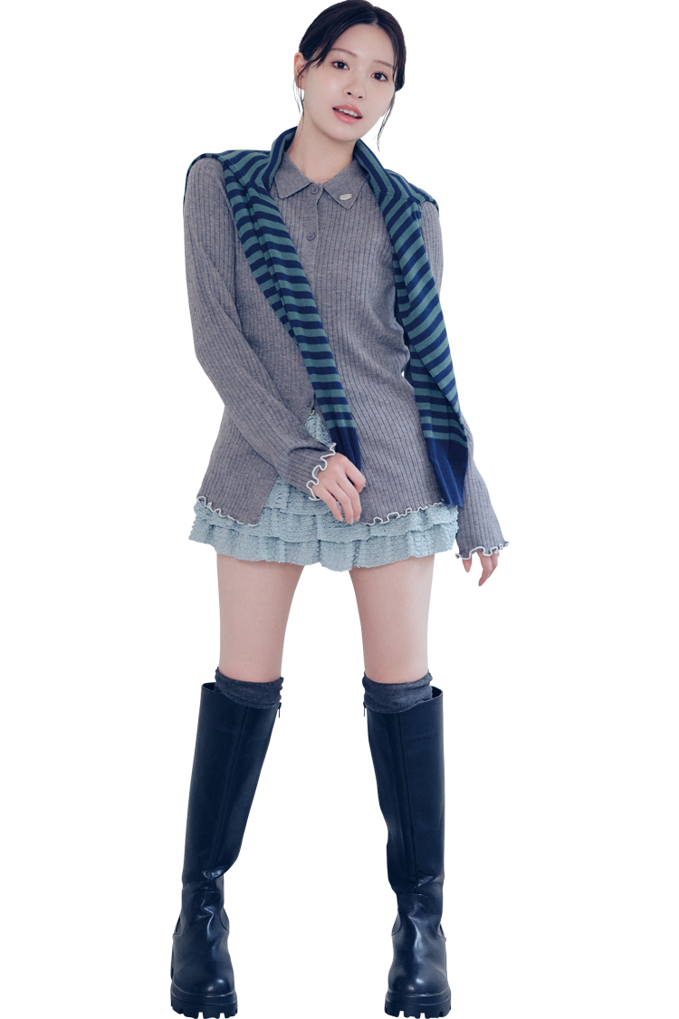 パッと目を引くクリスマスカラーな赤は冬のムードを高めてくれる。強くなりがちな赤をチュールのスカートでガーリーに落とし込んで。