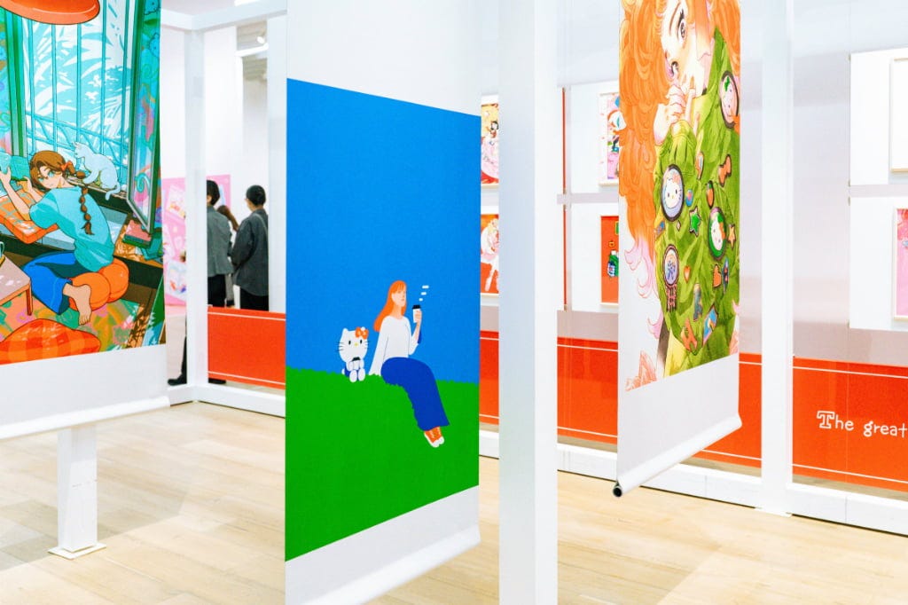 「わたしとキティ」を題材に、30人のアーティストがイラストレーションを描き下ろし(一部を除く)。ハローキティグッズのある些細な日常を描いたものや、ポップな色彩で表現したものなど、さまざまなハローキティの姿を存分に堪能できます。