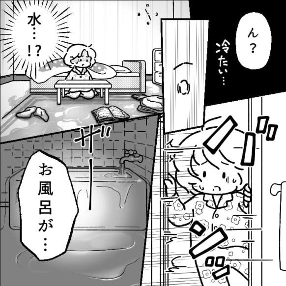 起きると部屋一面の床が水浸しになっていました。どうやら、お風呂から水があふれてしまったようです。
