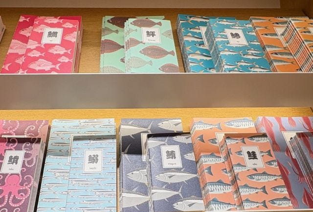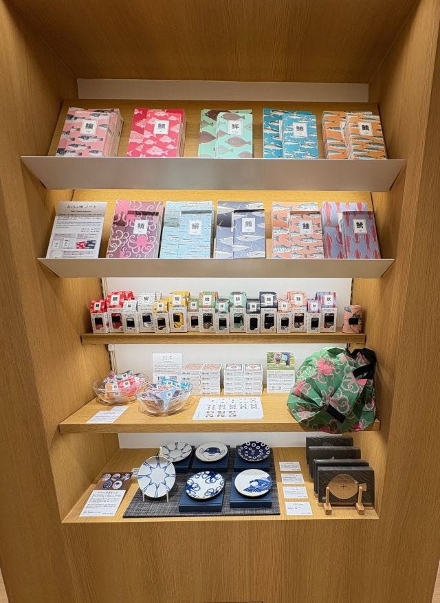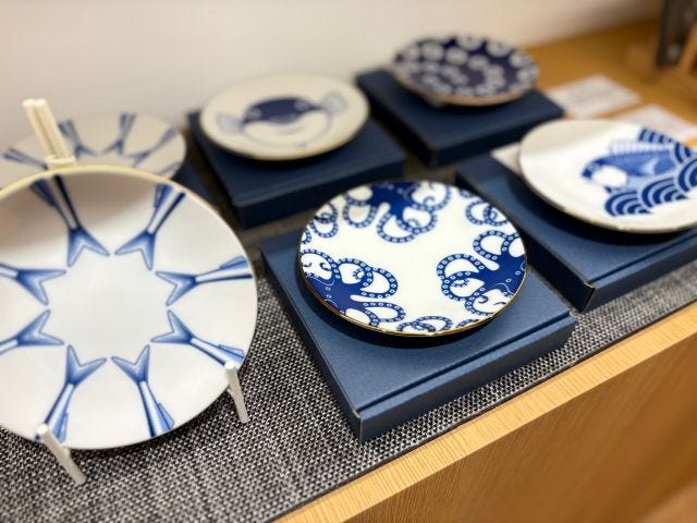 日本の食卓に並ぶ「海の幸」をユーモラスに描いた、おいしい魚シリーズ。新作の「おいしい魚 美濃焼小皿」(4寸) 1,650円は、海外の旅行者にも人気です。