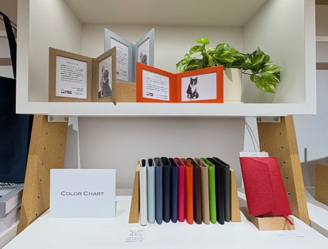 「COLOR CHART」では、パスケースやペン、ブックカバー、メガネケース、バッグタグなど、ビジネスにもプライベートにも使えるカラフルなアイテムが充実。