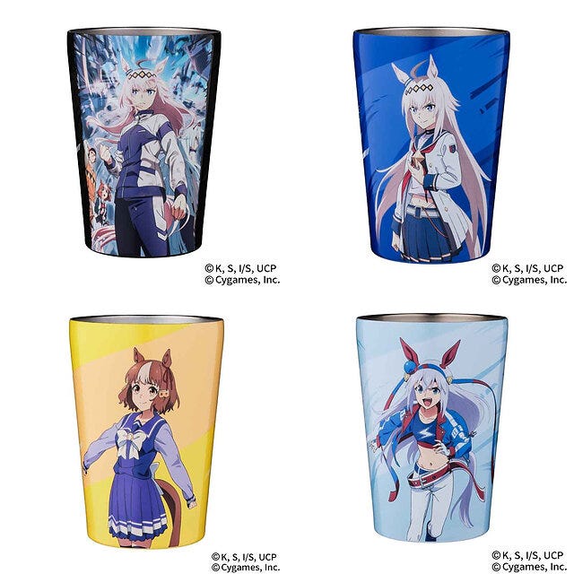 大人気ウマ娘のアートがあしらわれた、直接飲み物を入れても、コンビニやカフェでテイクアウトしたコーヒーをカップごと入れても使える、真空断熱カップコーヒータンブラー4種。